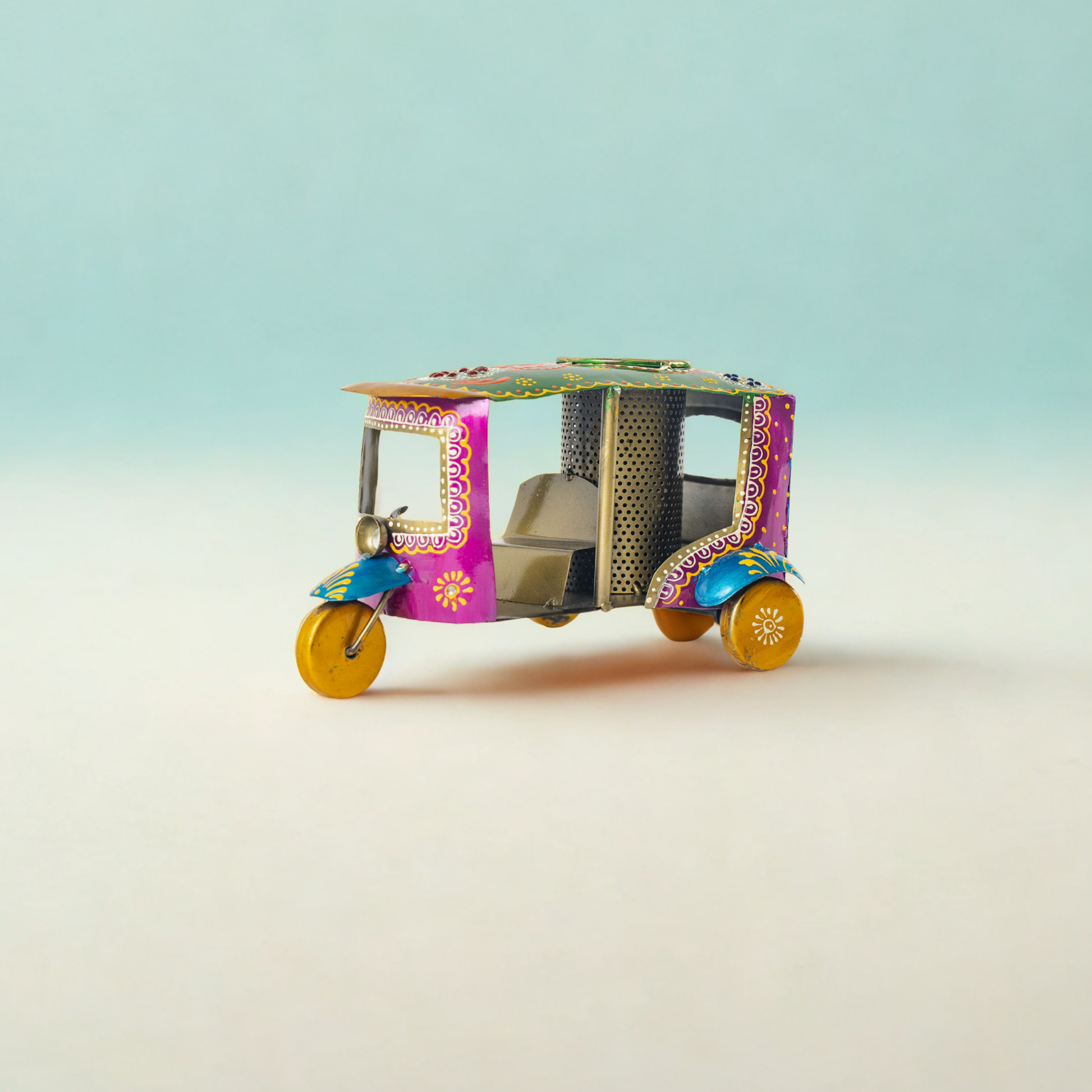 Bring a splash of color and creativity to your desk with this vibrant Hand-Painted Auto Rickshaw Pen Stand! Crafted from metal and beautifully detailed with traditional Indian art, this quirky design doubles as a pen holder and a charming décor accent. The intricate patterns and bright hues add a joyful, desi touch to your workspace or study area.