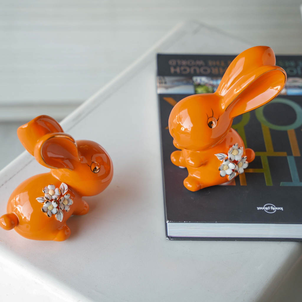 Add a dash of cuteness to your décor with these vibrant orange ceramic bunny figurines. Adorned with delicate floral accents, these bunnies bring charm and playfulness to any corner of your home. Perfect for kids’ rooms, festive décor, gifting, or as tabletop accents.
