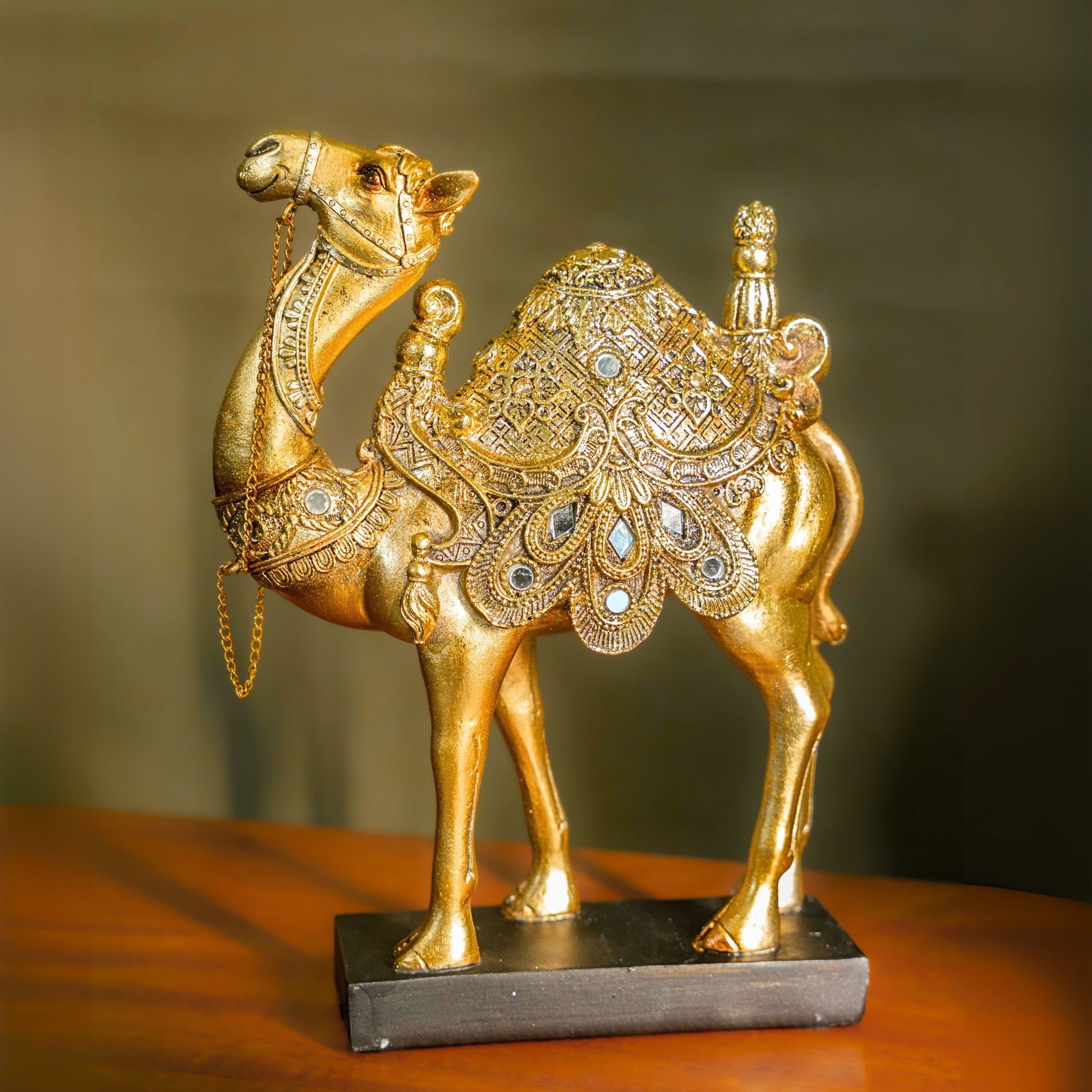 Embrace the charm of royal craftsmanship with this exquisite Golden Camel Figurine. Featuring detailed hand-carved patterns, mirror inlays, and a finely adorned saddle, this décor piece reflects elegance and prosperity. The golden finish with a delicate chain accent adds a regal aura, making it a standout addition to your home or office décor.