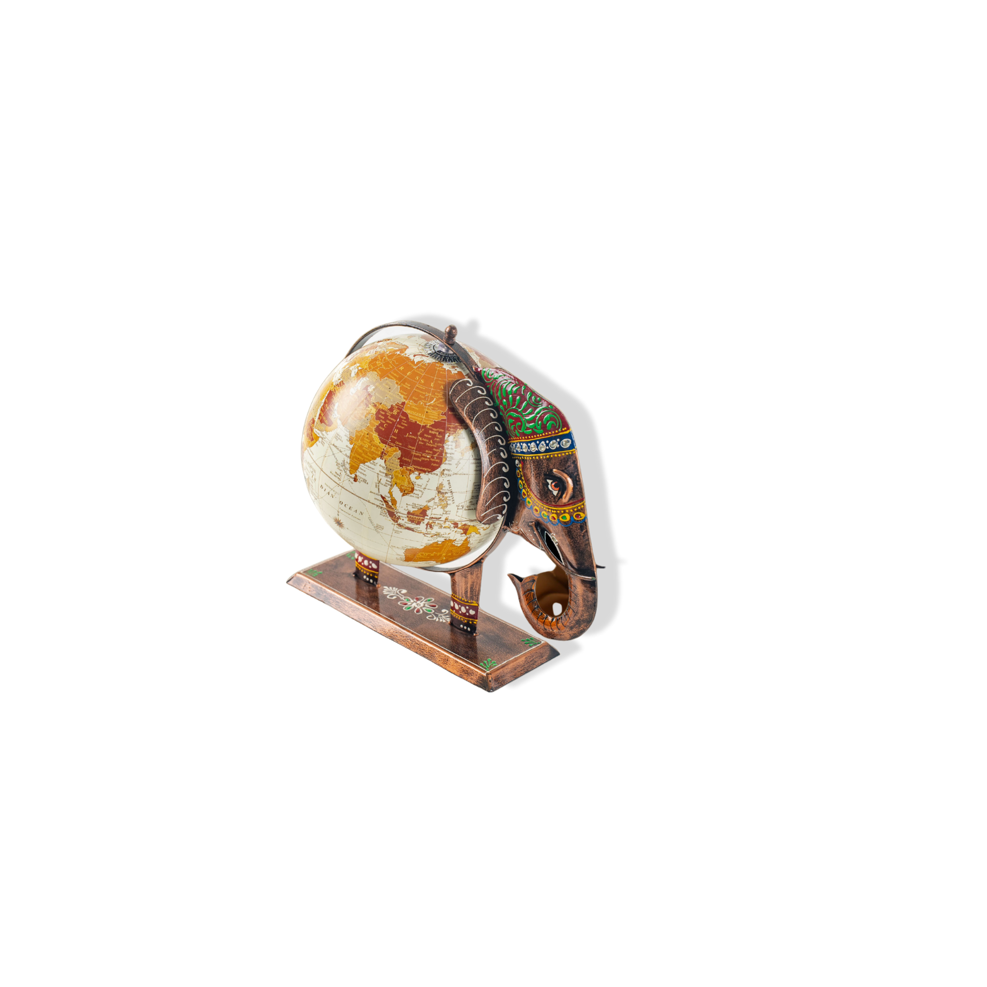 Stunning handcrafted wooden elephant figurine adorned with colorful traditional artwork, elegantly holding a rotating world globe. A perfect blend of cultural artistry and global perspective.