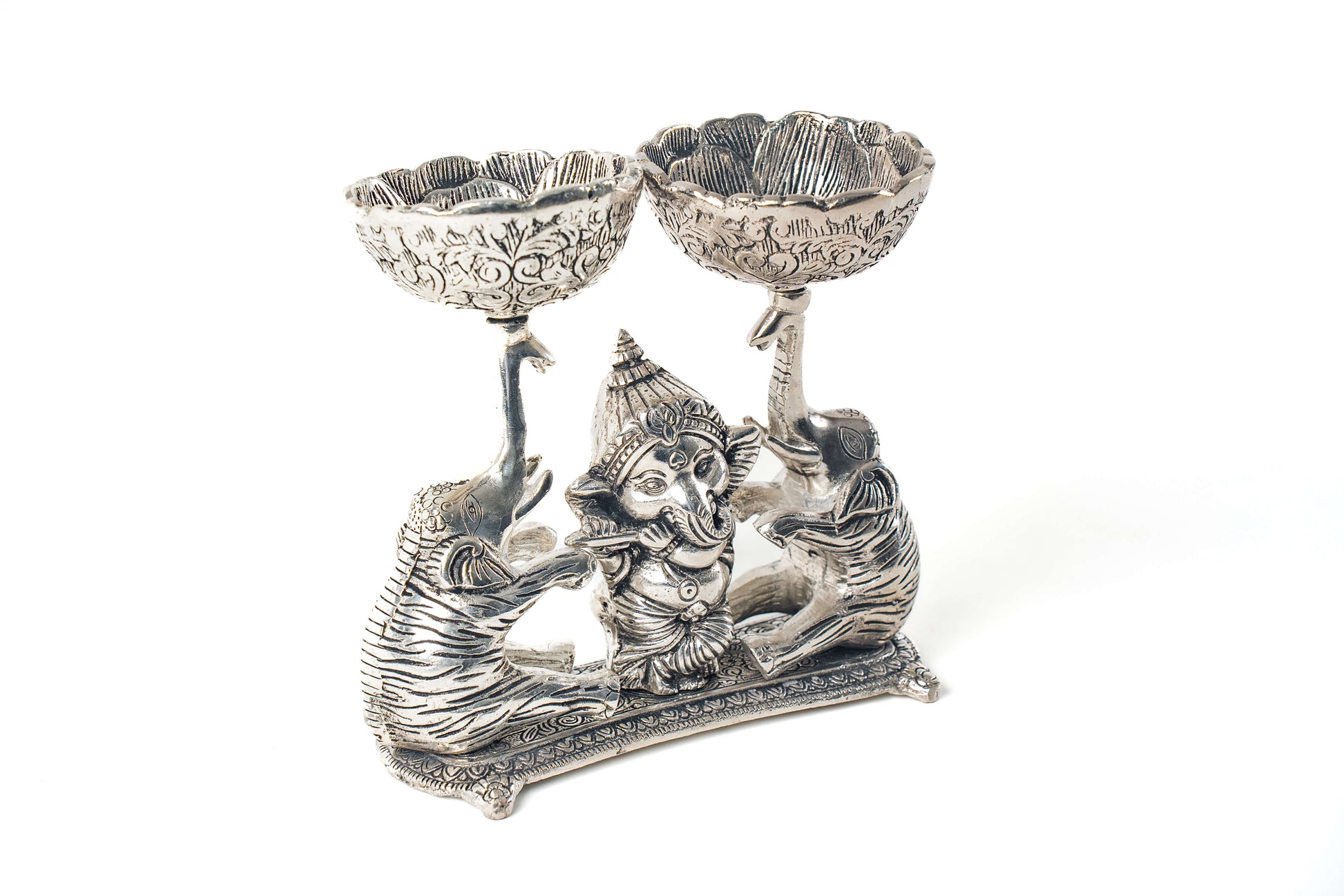 Exquisite metal decorative stand featuring Lord Ganesha flanked by two graceful peacocks, each holding an ornately carved bowl. A divine piece perfect for festive decor and spiritual settings.