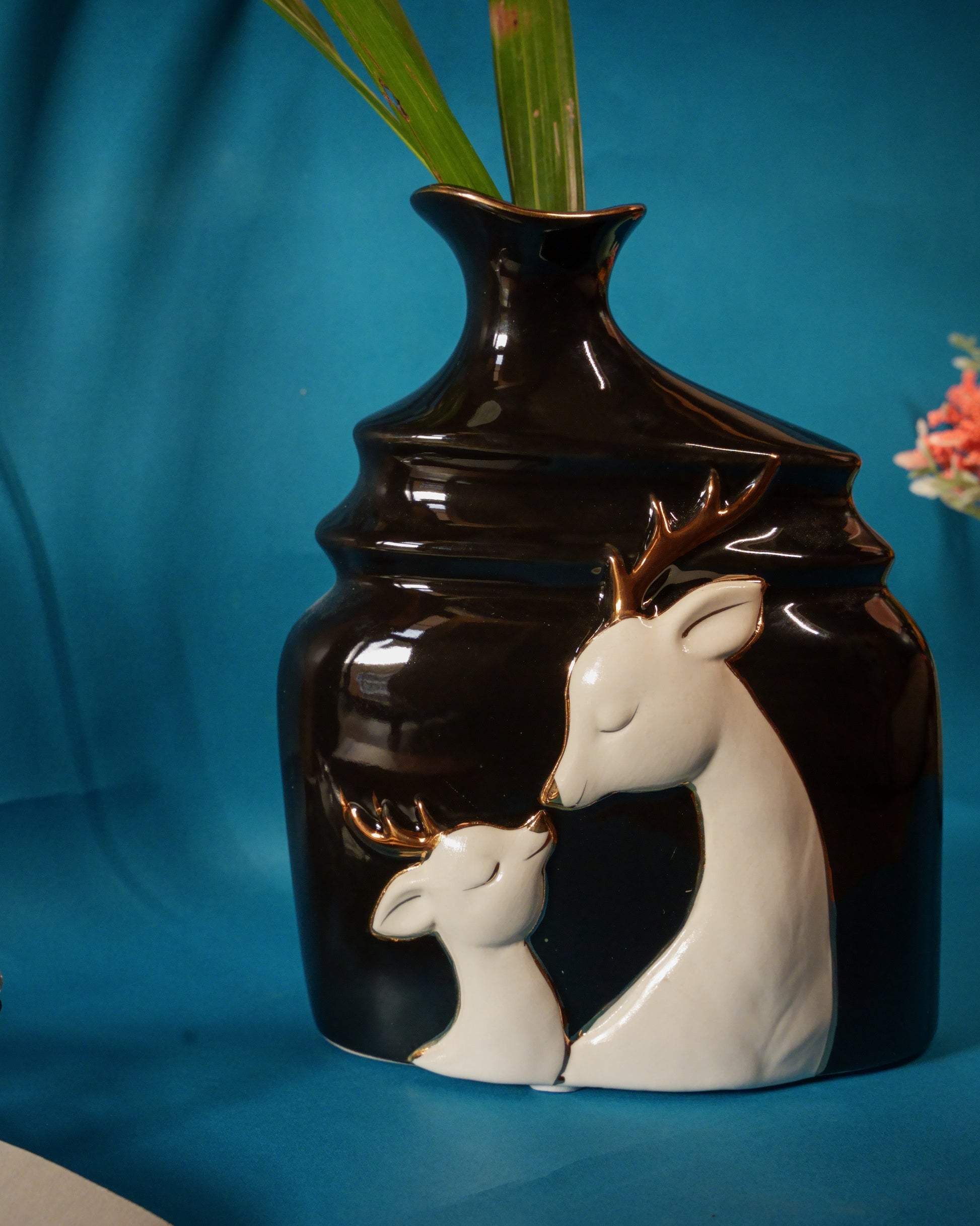 Add elegance with a touch of warmth to your home décor with this stunning black ceramic vase. Adorned with a beautiful embossed deer motif symbolizing love and togetherness, it makes a perfect centerpiece for fresh or artificial flowers. Its glossy finish and artistic design make it ideal for living rooms, bedrooms, or gifting.