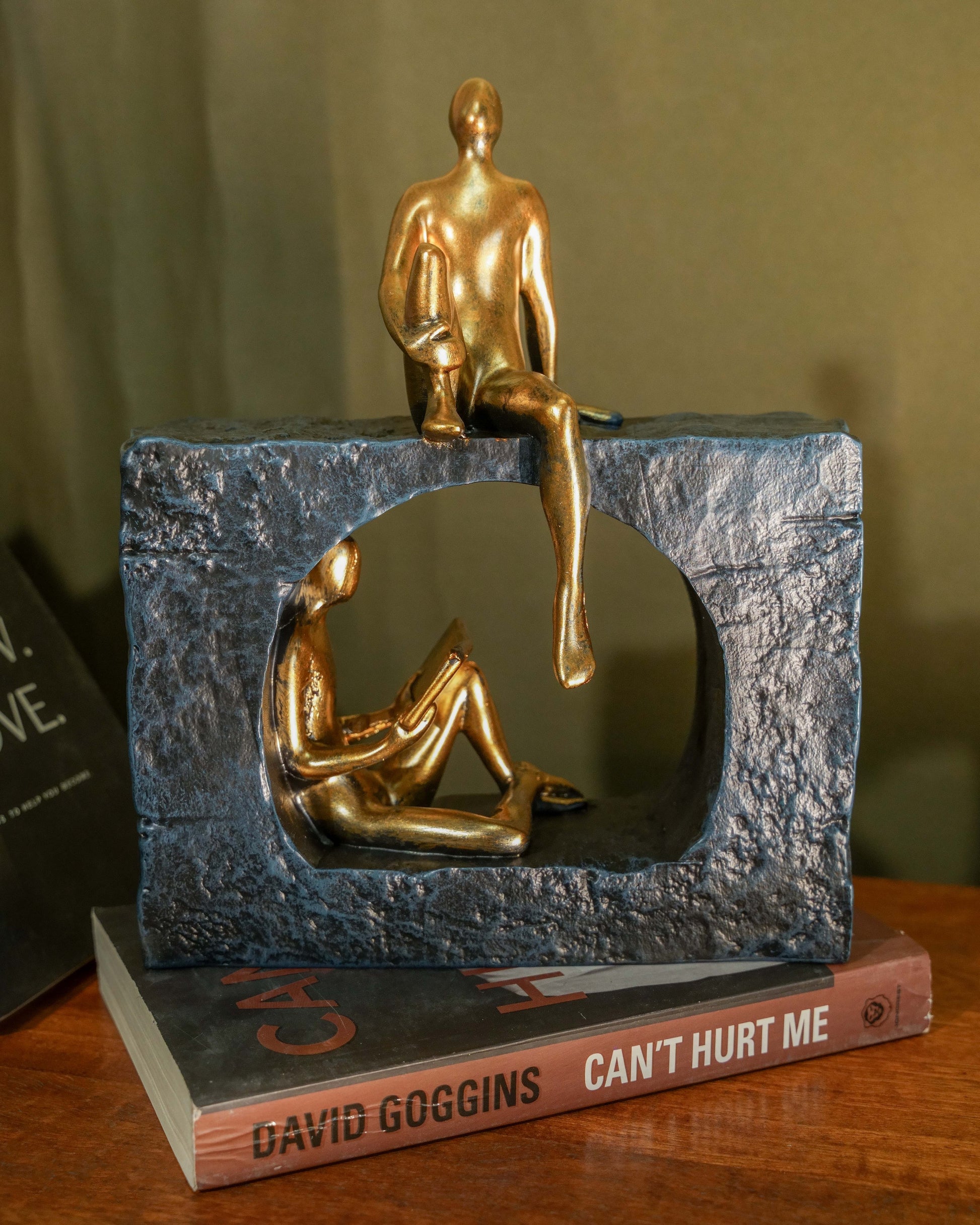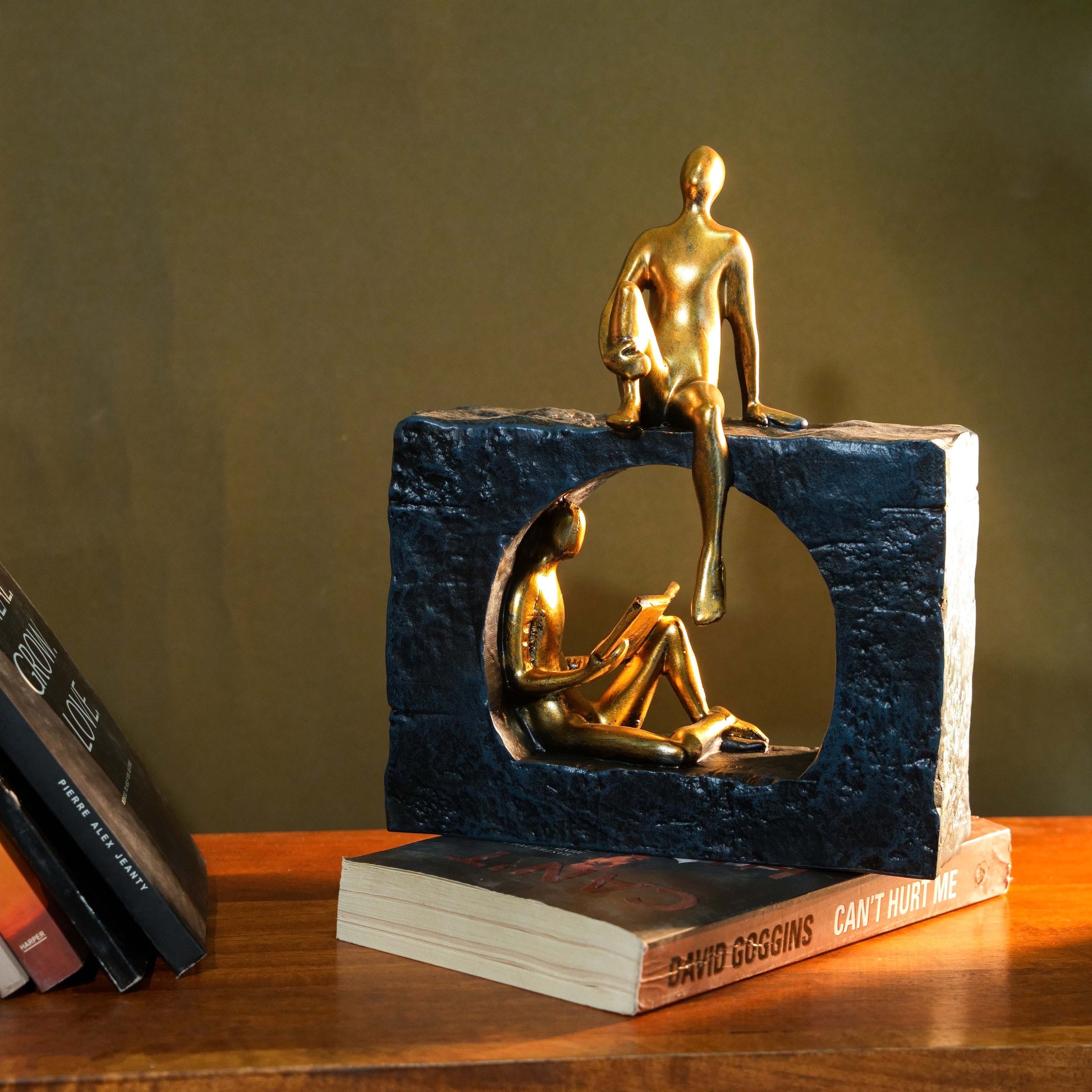 Add a touch of artistic elegance to your space with this beautifully crafted abstract figurine sculpture. Designed with a rustic stone-textured frame and golden-toned human figures, it symbolizes creativity, relaxation, and connection. One figure is seated atop the frame in a thoughtful pose, while the other enjoys reading inside the arch – making it a perfect piece for book lovers, thinkers, and art enthusiasts.