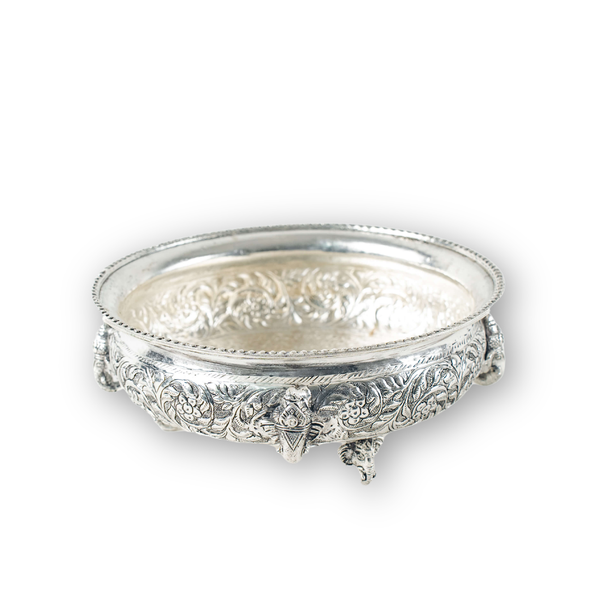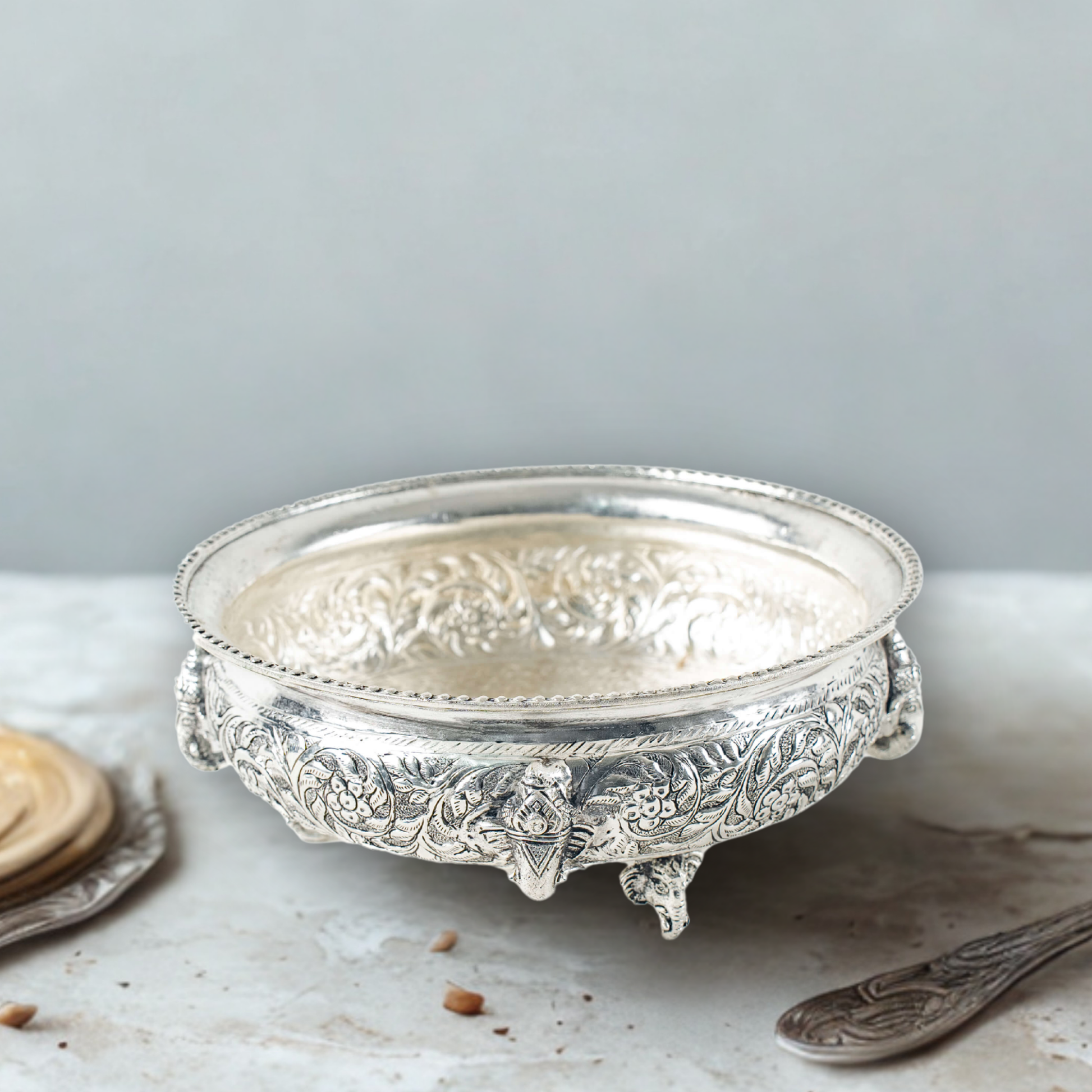 Bring home a touch of royal heritage with this intricately handcrafted silver-toned urli bowl. Designed with detailed floral engravings and traditional motifs, this piece exudes timeless charm and grace. Perfect for floating flowers, candles, or potpourri, it instantly enhances the aura of any space.